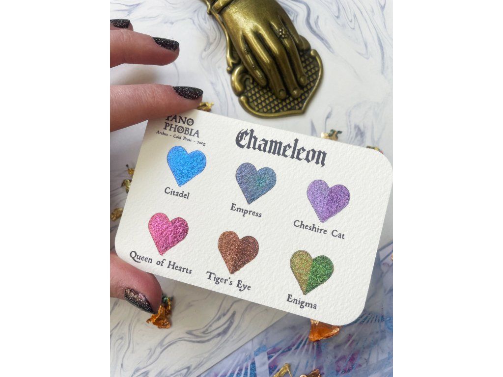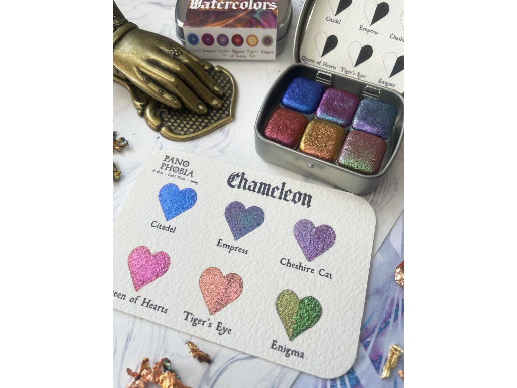 Paletka ručně vyráběných měňavých akvarelů. Chcete zažít největší kouzla, které barvy dokážou? Chameleon barvy se mění pod úhlem pohledu a v závislosti na dopadu světla, takže jedna barva obsahuje celé spektrum dalších barevných odstínů. Magie.