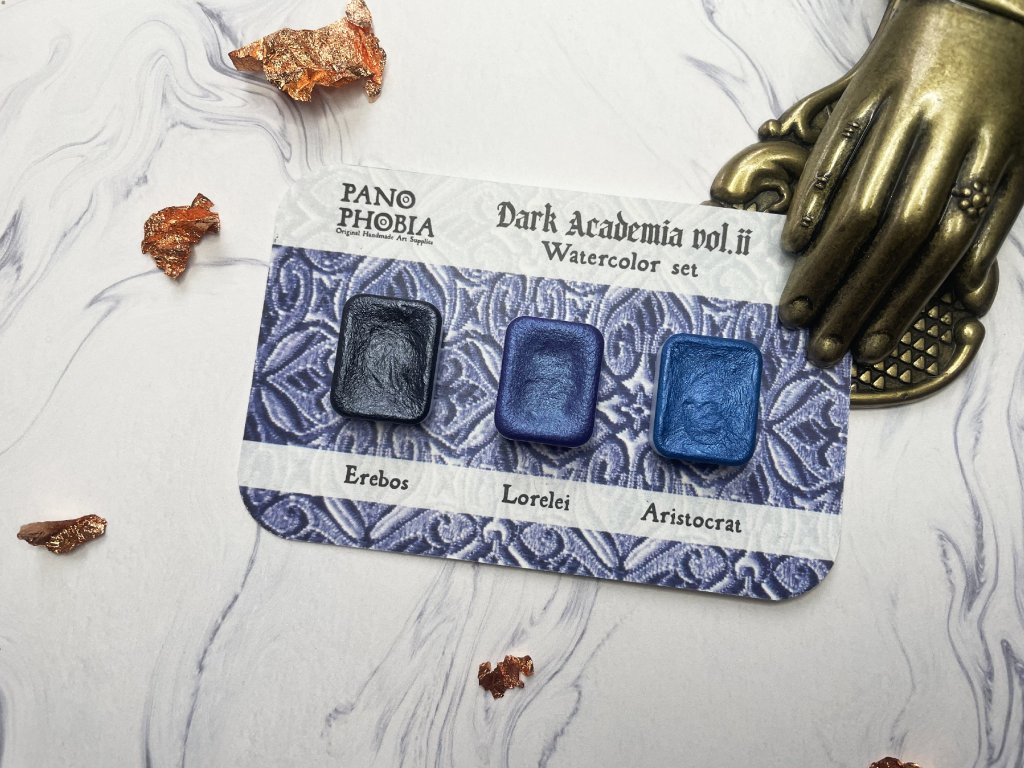 Vzorník obsahuje 3 třpytivé, ručně vyrobené akvarelové barvy.